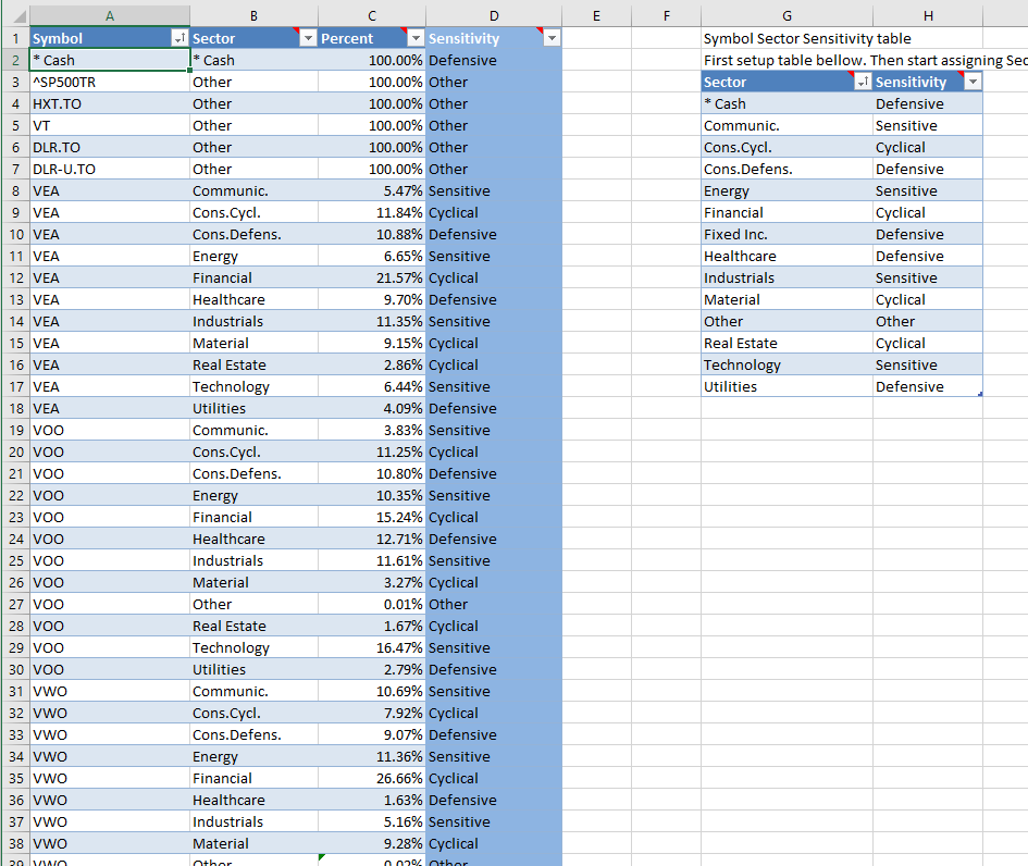 For each symbol you can assign both Sector and Sensitivity. When you first start using Portfolio Slicer, you can leave this table empty and then add data later when you want to see more detailed reports.