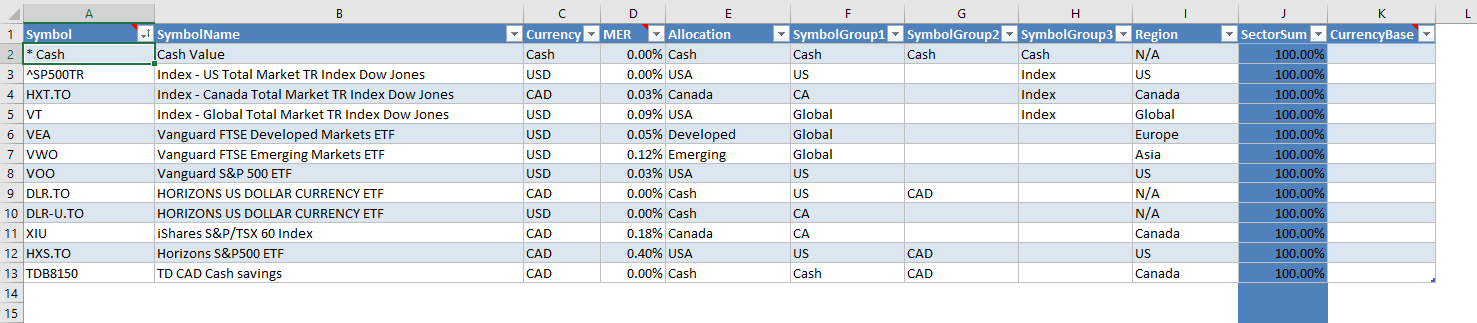 Symbol- your investment short code, symbol, or ticker. It should match theSymbolcolumn in Quotes.csv exactly.SymbolName- a descriptive name for the symbol.Currency- symbol currency. It must match one of the values in the Report Currency table. Otherwise, the background will be red and calculations might not work properly.MER- Management Expense Ratio. This must be a numeric value expressed in percent. Example:0.40%. This information is used to calculate the approximate amount you pay as fees, usually hidden, for mutual funds or ETFs.Allocation- symbol assigned allocation. It must match one of the values in the Allocation table, otherwise the background will be red.SymbolGroup1- custom grouping field.SymbolGroup2- custom grouping field.SymbolGroup3- custom grouping field.Region- region that you want to assign this symbol to. This value can be used for custom grouping.SectorSum- calculated field that shows the symbol summary ofPercentvalues in the SymbolSector table. It should be used to confirm that values add up to 100%.CurrencyBase- not implemented.